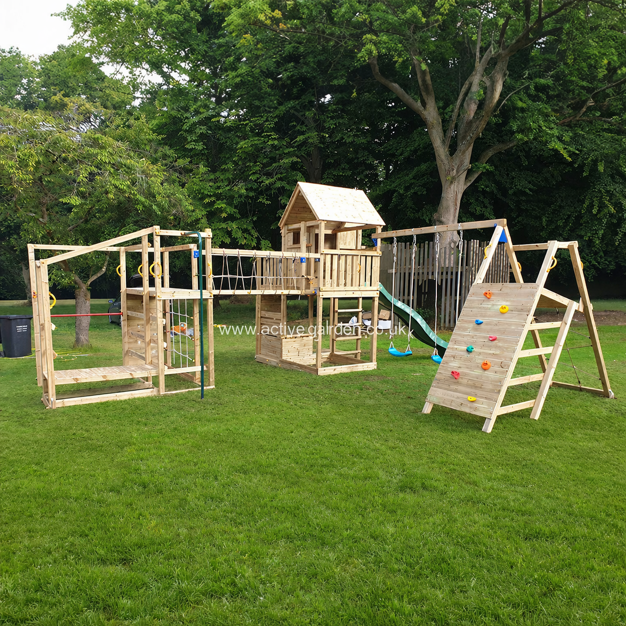 This amazing combo has it all: Slide, swings, monkey bars, fireman’s pole playhouse/den and lots of climbing with nets, ladders and rock wall. The Palazzo tower has got 2 platforms, one 1.5m high and the other 1.7m. The top platform has an enclosed den that can be accessed by rock wall and vertical ladder. The bottom platform has a 3m slide and ladder. At ground level there is a decking and bench. The Crossfit is all about vertical climbing, monkey bars and a fireman’s pole. They are joined by the net bridge. The Challenger module adds a wide rock wall at an angle, a net, ladder and sloping platform, plus 2 swing seats