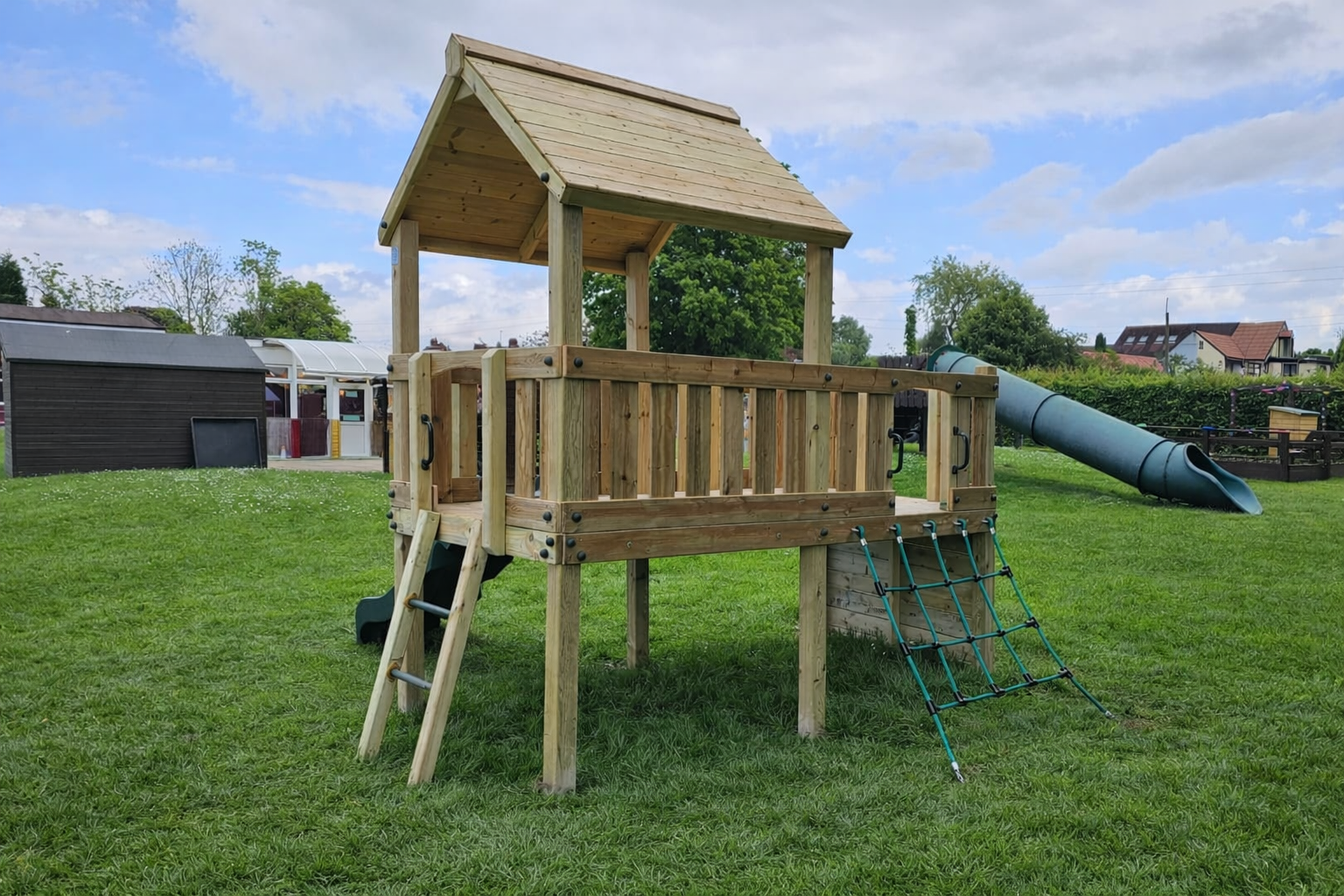 I has a vertical climbing wall, ladder and net, an HDPE commercial standard slide from a 1m platform high. The wooden roof covers half of the platform, an area of 1.4 x 1.4m and has another space without roof of 1.4×1.4m.