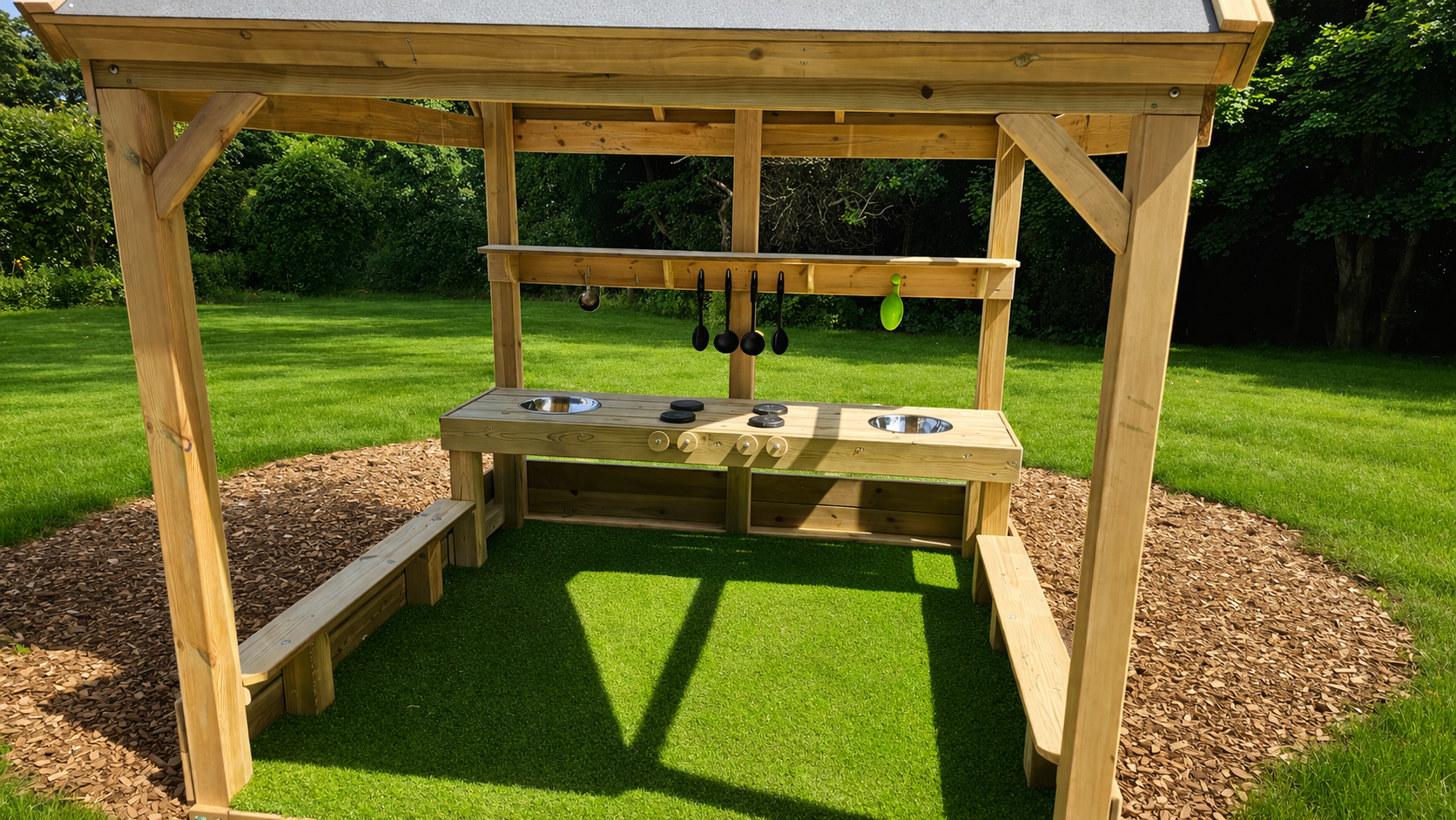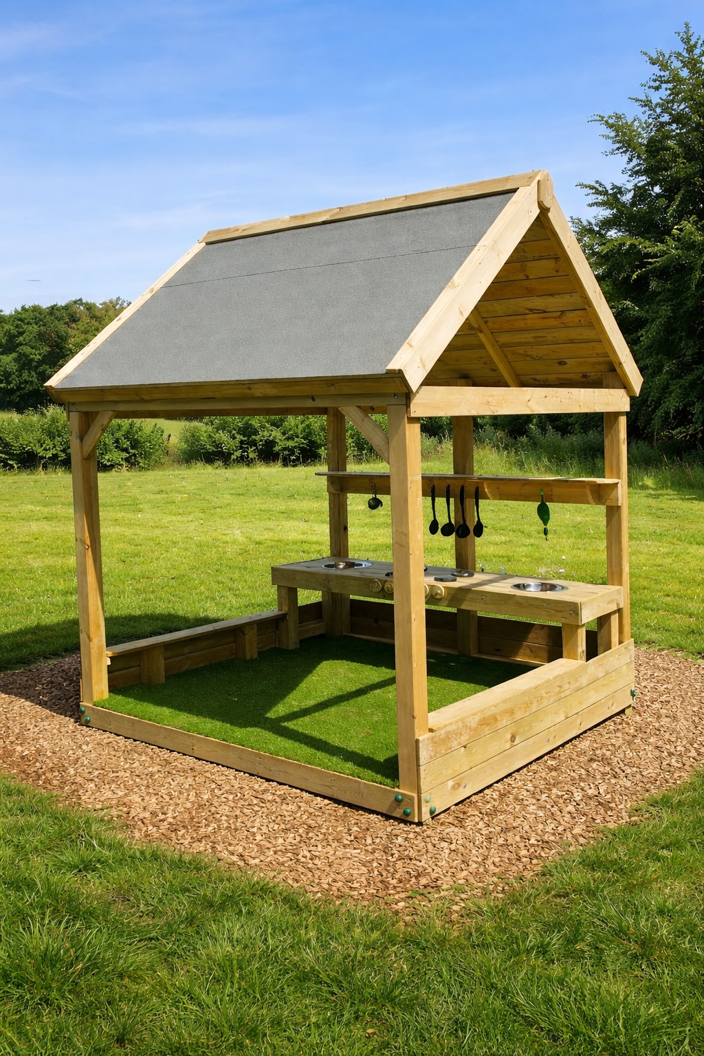 This Mud Hut is great for nurseries and schools. It comes with an artificial grass floor, seats on 2 sides, and a big mud kitchen with shelf, utensils, bowls and hobs.